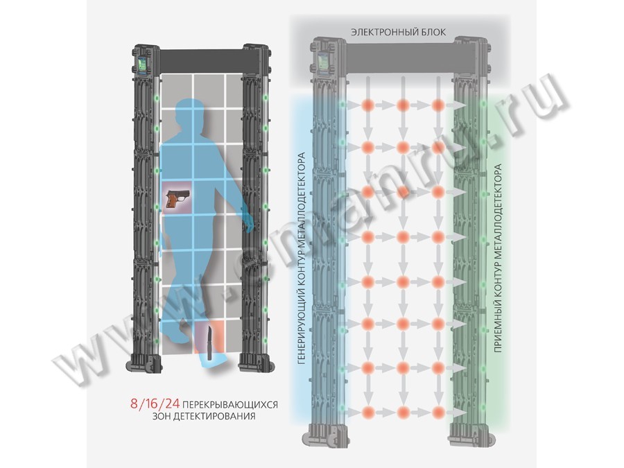 Степень пылевлагозащищенности - IP-55. Он очень прост в использовании и в настройке. Наличие жидкокристаллического дисплея с сенсорным управлением, расположенного с торцевой части металлодетектора, а также три способа подключения к сети (справа, слева, сверху) являются основными преимуществами модели БЛОКПОСТ РС Z 800|1600|2400. Наличие светодиодных индикаторов, располагающихся по боковым антенным панелям, позволяет очень быстро оценить местоположение запрещенных металлических предметов на теле человека. Для подсчета количества проходящих людей (на вход и на выход) через металлодетектор используется уникальная технология передачи инфракрасного сигнала за счет использования инновационных приемо-передающих ИК-датчиков. Доступный интерфейс блока управления, высокая степень безопасности, универсальная применимость, высокая чувствительность, широкий диапазон детектирования, нечувствительность к помехам, возможность эксплуатации в течение 24 часов в интеллектуальном режиме с выдачей одновременно звуковых и световых сигналов тревоги, высокое качество, эффективность и отличные технические характеристики – все эти параметры находятся на самом современном мировом уровне. Металлодетекторы БЛОКПОСТ РС Z 800|1600|2400 безвредны для человеческого организма. Используется магнитное поле низкой интенсивности, безопасное для людей с кардиостимуляторами, слуховыми аппаратами, беременных женщин. БЛОКПОСТ РС Z 800|1600|2400 предназначен для использования при проведении культурно-массовых мероприятий, выездных праздников и на временных объектах.