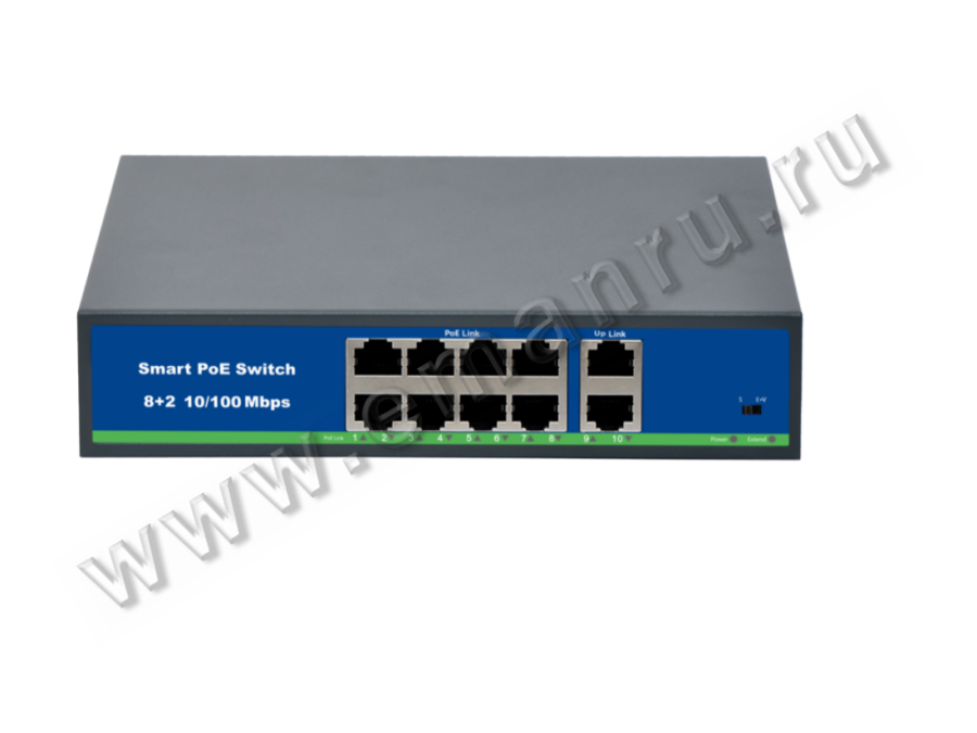 8-ми портовый PoE-коммутатор с 2-мя портами uplinkа, PoE порты: 8(10/100Мбит/с), Порт подключения: 2(10/100Мбит/с). Соответствие : FCC часть 15 класс А, CE. Стандарт PoE: IEEE 802.3af/at, PoE запас питания: 78 Вт, PoE тип питания: 1/2 (+), 3/6 (-). Рабочая температура: -10 +55 °C, потребляемая мощность адаптера: 100-240V AC, 50/60Hz, потребляемая мощность: 120 Вт. Возможность передачи информации до 250м.